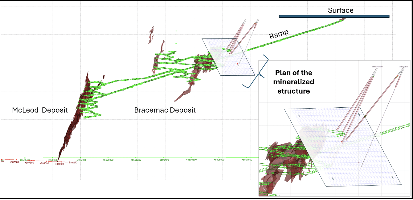 Intersected in 2023, the McLeod Mine extension demonstrated the potential for additional resources adjacent to existing mine workings, at the permitted past-producing Bracemac-McLeod Mine.