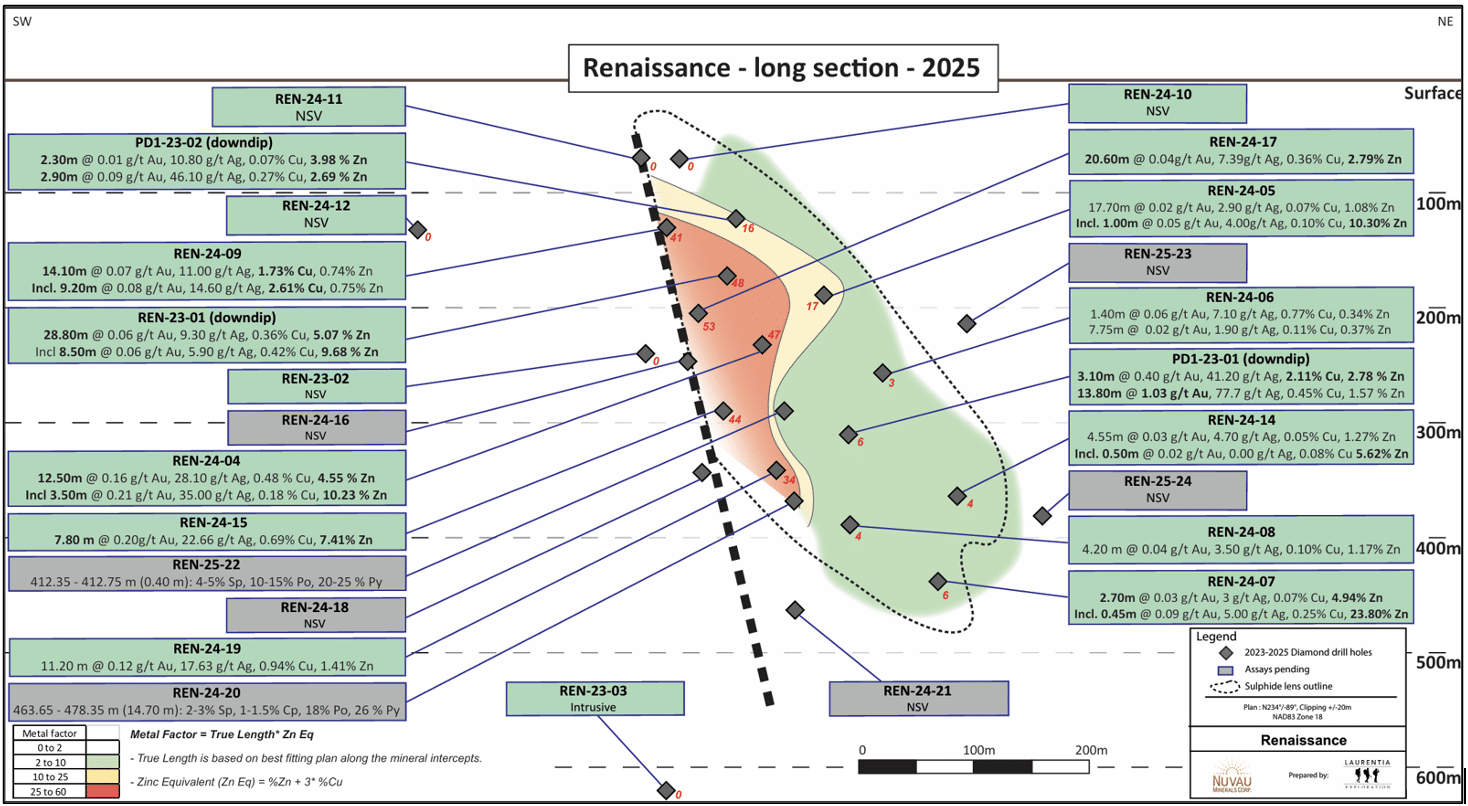 The Renaissance Zone was discovered by Nuvau in 2023, targeting a geophysical anomaly located in the “West Camp” of the Matagami Property, immediately north of the Caber Complex deposits.