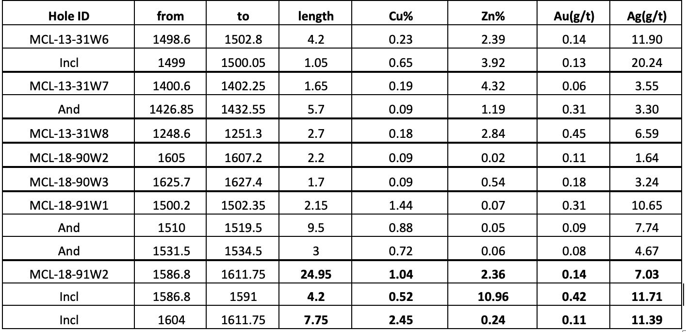 The extension discovery hole (MCL-13-31W1) returned 15.9 m grading 2.81% Cu, 14.80% Zn, and
