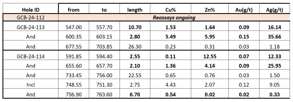- GCB-24-113: 5.49% Cu, 5.95% Zn, 0.15 g/t Au, and 35.66 g/t Ag – 2.8 m