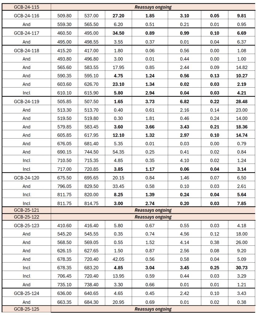 - GCB-24-116: 1.85% Cu, 3.10% Zn, 0.05 g/t Au, and 9.81 g/t Ag – 27.2 m