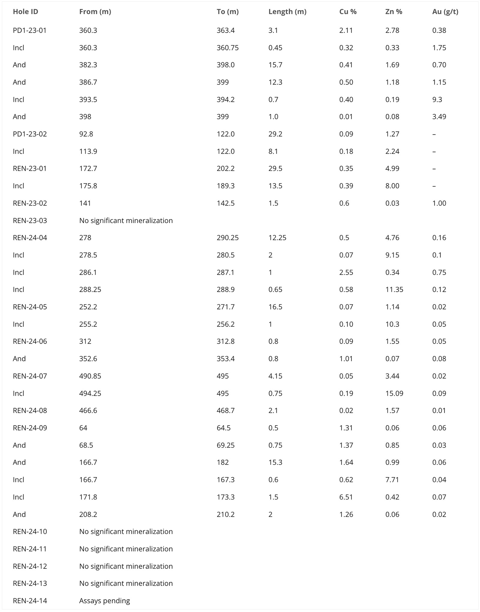 Table 4 Significant results for the 2023 to 2024 Renaissance drilling program
