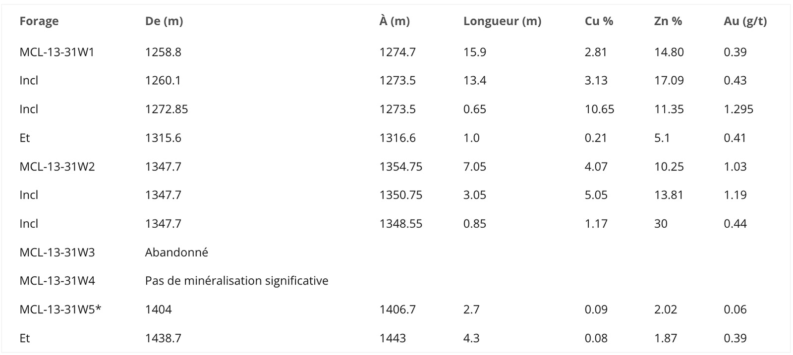 - · L’extension McLeod a également été découverte en 2023 à la mine Bracemac McLeod. Cette découverte démontre le potentiel de ressources supplémentaires de cette propriété autorisée à produire. Le trou de découverte (MCL-13-31W1) a recoupé 15,9 m à 2,81 % de Cu, 14,80 % de Zn et 0,39 g/t d’Au.Le tableau ci-dessous présente les résultats du programme de forage de McLeod.