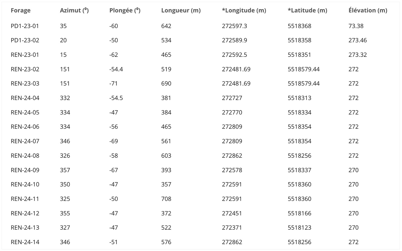 *UTM (Coordonnées NAD83 – Zone 18N). La longueur est calculée à partir du collet du forage et non à partir de la profondeur de la cale.