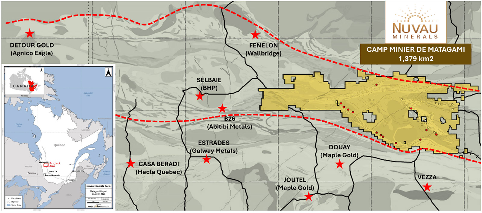 Figure 1: Position de la propriété Matagami de Nuvau au Canada et parmi les opérations et projets avancés du nord de l’Abitibi.