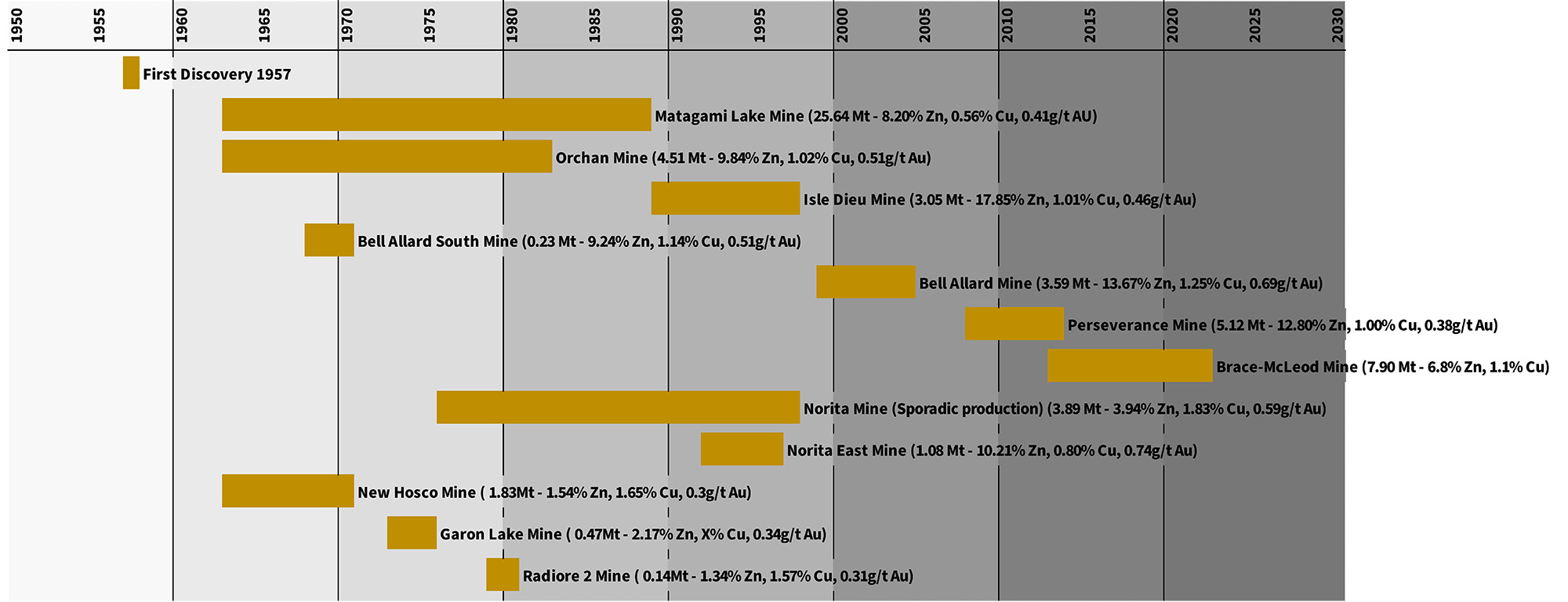The Bracemac-McLeod deposit was discovered in 2007. Development work commenced in the first quarter of 2010, and commercial production was up and running by May 2013. The tailings site was divided up once again, this time to accommodate the waste generated by the Bracemac-McLeod mine.